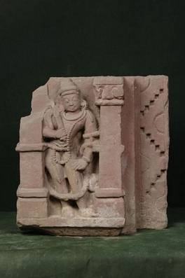 | Description / विवरण | The god, standing within a damaged niche, holds a sword in the right hand. A band with half petals each bordered by indented check pattern is to the left of the pilaster of the niche. Cf. Cat. 448, Pl. CVII and Cat. 449. |