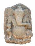 | Description / विवरण | Ganesa seated. The head is devoid of any head dress i.e. kirita except for small lump of hair done into receding tiers. The right rear hand holds a damaru while the left rear hand holds shield. The front right hand is in abhaya-mudra resting on the knee while front left hand holds modaka. The trunk is very short which curves immediately towards left. It is devoid of any ornamentation. Probably it is unfinished. The right leg rests firmly on the base where as the left one is bent and turned inwards. |