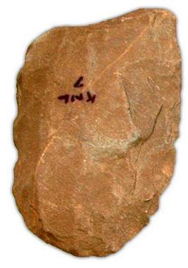 | Description / विवरण | Implement made on flake with thick butt end and flat functional edge. Partly retained pebbly cortex surface on the dorsal side having multiple flake scars, flat under surface with wavy edges, a long white quartz vein is prominently seen on the ventral side. |