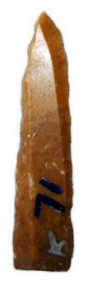| Description / विवरण | Untouched triangular shaped flake with long flake scar extended from top to distal flat end, serrated edge on one side. |