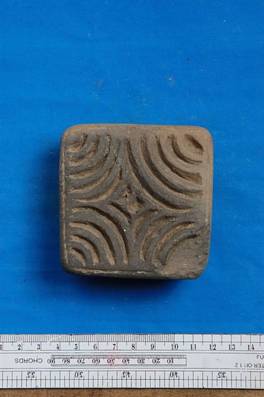 | Description / विवरण | Square object containing semi circular and check designs. Damaged at a corner. |