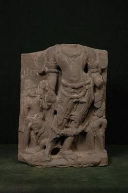 | Description / विवरण | Headless Siva standing in tribhanga, flanked by two attendants. Nandi is depicted behind the god. |