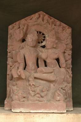 | Description / विवरण | The god is seated in ardhaparyankasana, Parvati on his lap. Below them are a couple worshipping, the bull and lion vahanas, Karttikeya and Ganesa, and door keepers. The throne back is decorated with conventional motifs. On top are a pair of Vidyadharas and two seated female figures holding pots |