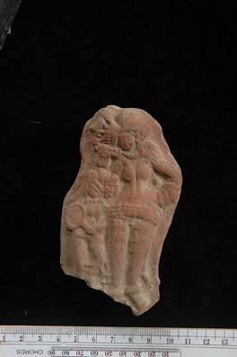 | Description / विवरण | Terracotta plaque depicting two standing female figures. The lady standing on the left holds a round mirror and is short statured while the lady on the right is tall. Both of them have an elaborate headdress. Lower portion of the plaque damaged. |