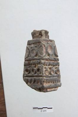 | Description / विवरण | Pyramid shape of object with small ,round tip on top. Object has various design all over the surface ,three round motif on top then small circles within frame. Traces of red colour is visible. From side view different depictional details are clear for example concentric loop designs all over the surface |