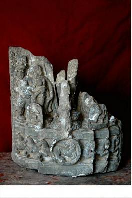 | Description / विवरण | Fragment of a Surya stele. The bearded, pot-bellied Pingala, Usha-Pratyusha with their bow and arrow, the seven horses clearly visible. |