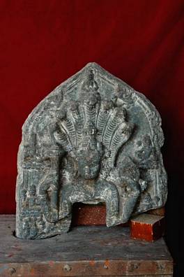 | Description / विवरण | Upper fragment of a stele representing Lokeshvara-Vishnu identified by the snake hood and the small seated meditating figure on it. Many other seated figures in different postures also represented. |