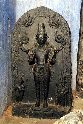 | Description / विवरण | Surya wearing a high headress, accompanied by his usual attendants Danda and Pingala. Flame motifs are carved along the rim of the stele. |