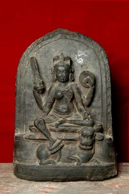 | Description / विवरण | Four-armed Durga seated in lalitasana on a lotus seat placed on the lion which is her characterisitc vahana or vehicle. |