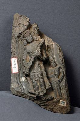 | Description / विवरण | Figure of Saraswati holding vina. Fragment of a stele representing Visnu and his attendants Lakshmi and Saraswati. |