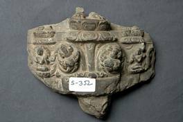 | Description / विवरण | Pedestal detail of a stele. Lotus seat of the central deity as well as the accompanying deities. Two figures with hands in adoration depicted below. |
