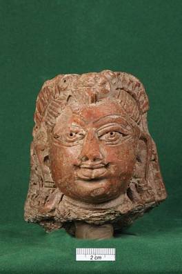| Description / विवरण | The scales of the snake's skin is shown through punched circles. Modelling of the face is detailed. Right side of the forehead and nose injured. Coated with brown slip. |
