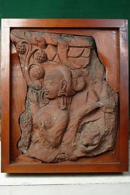 | Description / विवरण | The lady stands under a trip and she is touching the left side breast with her left hand. She holds branch of a tree with her right hand. The hair are combed back side tied in a loose knot. Behind the figure there is seen hand of a second figure. She may have been an attendant. |
