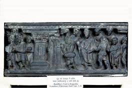 | Description / विवरण | To the right is the Buddha, accompanied by Vajrapani, monks and laity, entering Rajagrha, the gate of the city being shown to the left. He is preceded by Sakra, disguised as a manavaka who is announcing the approach of the Buddha by beat of drum. The fragmentary panel to the left shows a group of people carrying bowls of food to feed the Buddha’s party who were guests of the king Bimbisara. |