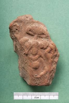 | Description / विवरण | Fragmentary terracotta plaque depicting a pot bellied figure standing under a umbrella. Right part of the plaque damaged. Hair arranged on both the sides of the head. Upper left part of the plaque missing. |