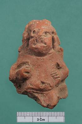 | Description / विवरण | Terracotta figure resting his hands on belly. Nose and mouth damaged. Lower part missing. |