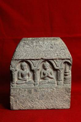 | Description / विवरण | Fragment of a composition. Buddha with hands on the lap probably holding an object depicted in the first niche and with hands in vyakhyana mudra depicted in the second niche. The third niche has a miniature stupa. |