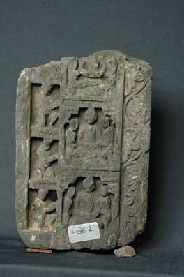 | Description / विवरण | Fragment of a doorjamb divided into many compartments. The figure of Buddha seated in dhyana mudra accompanied by attendants are depicted in each compartment. |