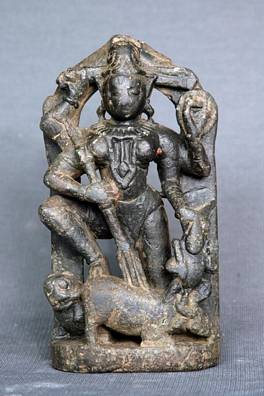 | Description / विवरण | Four-armed Durga Mahisasuramardini in the act of slaying the buffalo demon with her trident. The human form of the demon emerges from the animal body. The next image is the back side of the composition. |