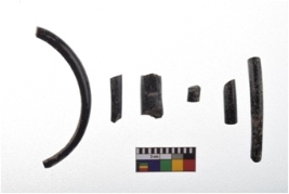 | Description / विवरण | A group of three monochrome opaque plain black and green coloured fragments glass bangle . |