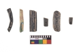 | Description / विवरण | A group of three monochrome opaque plain black and green coloured fragments glass bangle . |