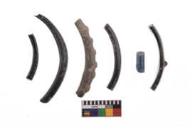 | Description / विवरण | A group of monochrome opaque black and blue coloured glass bangle . One fragment is decorated with white coloured dots in oval shaped. |