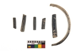 | Description / विवरण | The group of monochrome opaque plain black coloured fragments of glass bangle. |