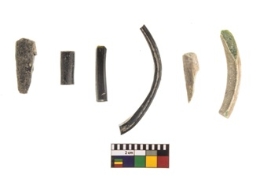 | Description / विवरण | A group of monochrome opaque plain black coloured glass bangle . Three bangle fragments are blue in coloured. |