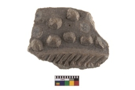 | Description / विवरण | A fragment of unburnished grey ware with applique band having slanting cuts,above it a cluster of applique conical knobs. |