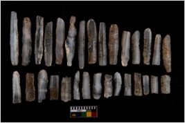 | Description / विवरण | A set of 30 intact microlithic blades, made up of chalcedony. All these blades have retoching and sharp edges. |