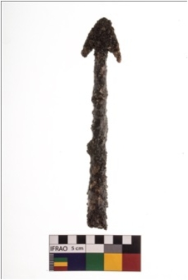 | Description / विवरण | A specimen of an iron arrow. It is partly broken from the end. It is rusted. |