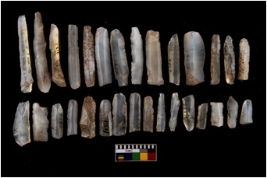 | Description / विवरण | A set of 30 intact microlithic blades, made up of chalcedony. All these blades have retoching and sharp edges. |