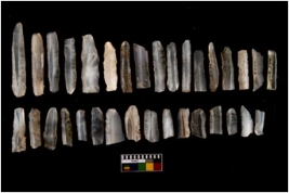 | Description / विवरण | A set of 30 intact microlithic blades, made up of chalcedony. All these blades have retoching and sharp edges. |