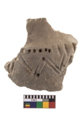 | Description / विवरण | A fragment of a grey ware with incised dot capping a design of zig-zag of multiple lines joined by incised dots. |