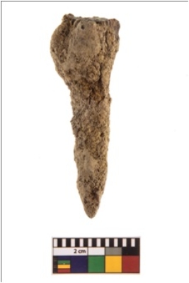 | Description / विवरण | A partially broken specimen of iron nail having rounded top and tapering end. It is rusted. |
