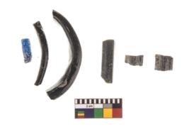 | Description / विवरण | The group of monochrome opaque plain black coloured fragments glass bangle . Variety in width. One fragment is decorated with parallel grooves and ridges on outer surface of the bangle. |