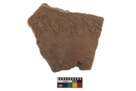 | Description / विवरण | A dull red thick sherd with a thick brown slip on the internal surface and with the external face deocrated by multiple shallow incised wavy lines. |