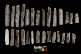 | Description / विवरण | A set of 28 intact microlithic blades, made up of chalcedony. Within this assemblage, 27 are made up of chalcedony and remaining 1 is made up of mikly quartz. All these blades have retoching and sharp edges. |
