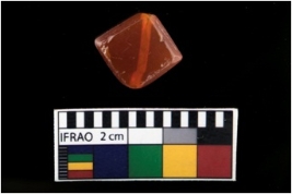 | Description / विवरण | Square carnelian bead with diagonal perforation. |