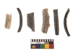| Description / विवरण | The group of monochrome opaque plain black coloured fragments glass bangle . Variety in width and thickness. Two fragments are decorated with white coloured small dots on the upper surface of the bangle. One fragment thick and decorated with red coloured oval shape dots on the lower green surface. |