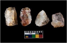 | Description / विवरण | There are n-4 of intact cores made up of Chalcedony. There are multidirectional irregular dominant scar pattern on both dorsal and ventral face of the cores. |