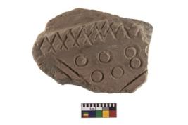 | Description / विवरण | Fragment of a coarse red ware with a band bearing incised hatched pattern capping circular stampings |