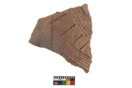 | Description / विवरण | A dull red ware sherd with an incised pattern of gropus of slanting and horizontal lines alternated by deep vertical incisions. |