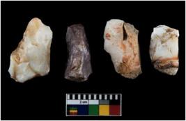 | Description / विवरण | There are n-4 of intact cores made up of Chalcedony. There are multidirectional irregular dominant scar pattern on both dorsal and ventral face of the cores. |