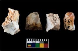 | Description / विवरण | There are n-4 of intact cores. Out of them 2 are made up of Chalcedony and 2 are made up of Chert. There are multidirectional irregular dominant scar pattern on both dorsal and ventral face of the cores. |