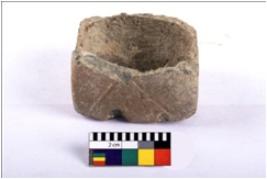 | Description / विवरण | One miniature votive tank is in intact condition with Chevron design on four of its outer sides |