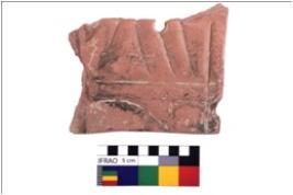| Description / विवरण | Decorative piece of red slate with initial view of geometrical designs |