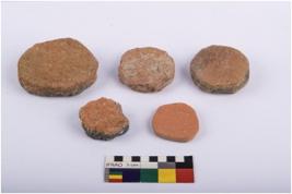 | Description / विवरण | Five circular disc of red ware, of which one is broken. |