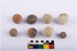 | Description / विवरण | Terracotta sling balls, eight in number of which three are unbaked. |