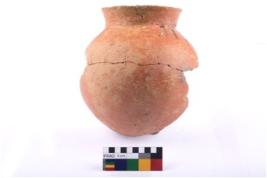 | Description / विवरण | Globular jar of red ware with incised design on the neck. |